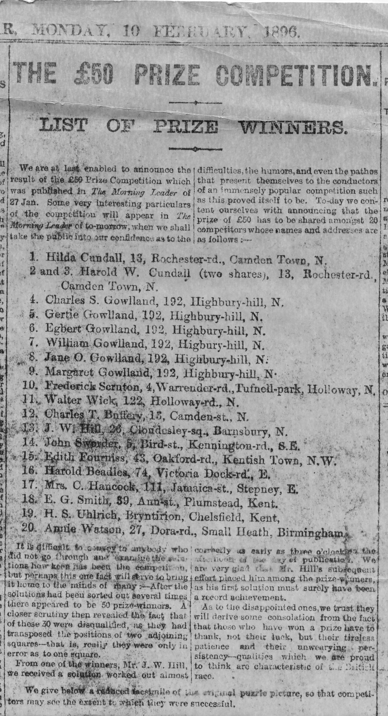 Photostat from 1896 newspaper sent by Gladys to Charles Septimus Gowlland showing winners of a competition.