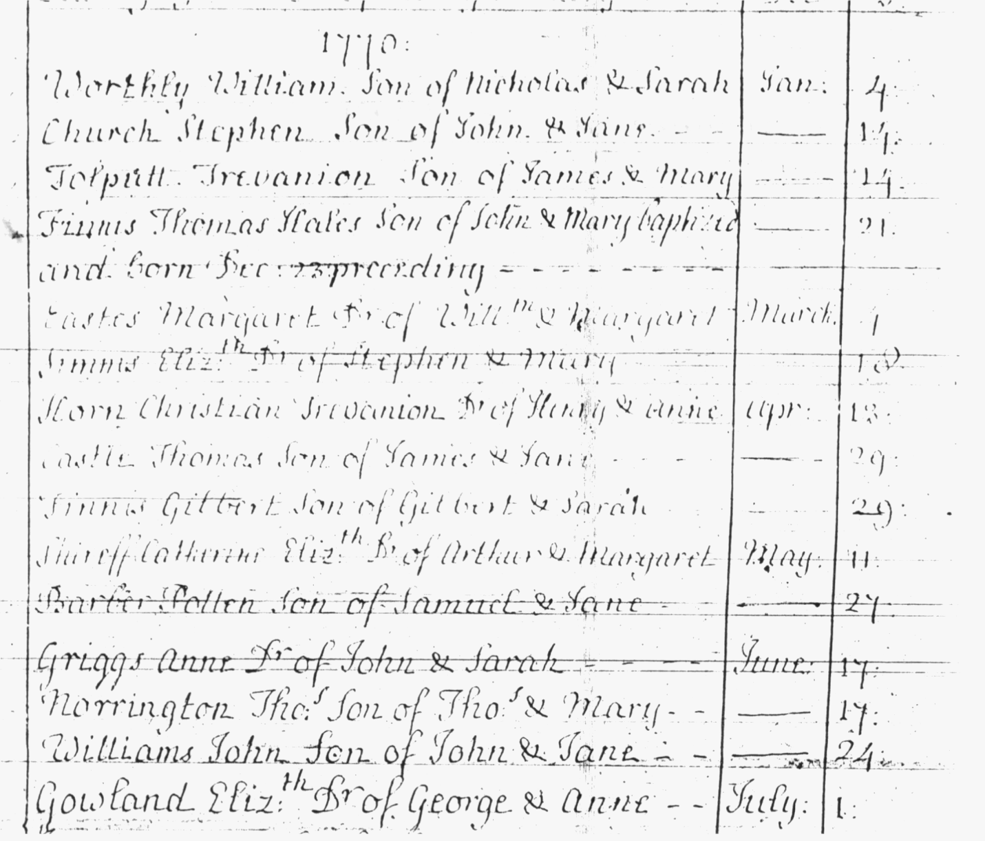 The annex to this article summarises, for the first time, the births, marriages and deaths of the Gowlland family in the 18th century from the time of Joseph and Susanna Gowlland. It only traces Gowllands and, therefore, excludes the children of married Gowlland girls. Even though a lot of the family appears to have been traced, there are still gaps, which hopefully will be filled over time.