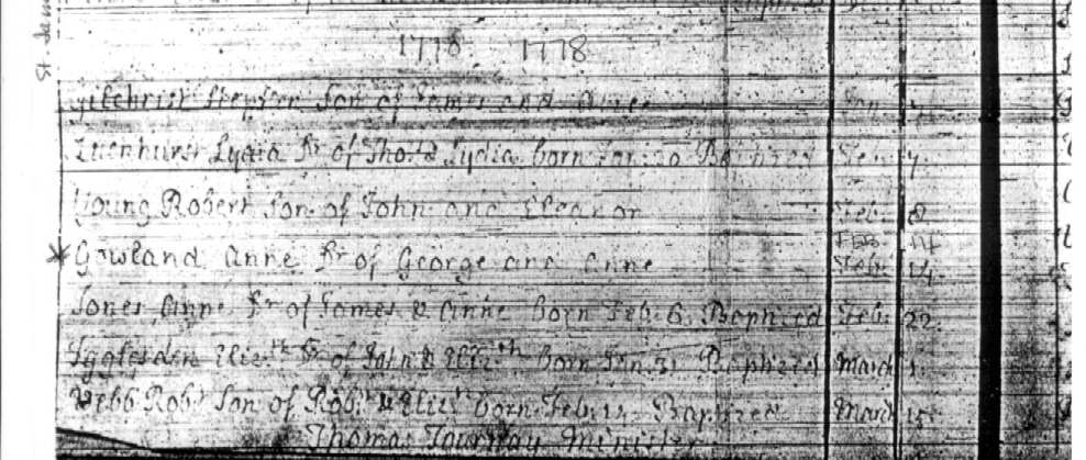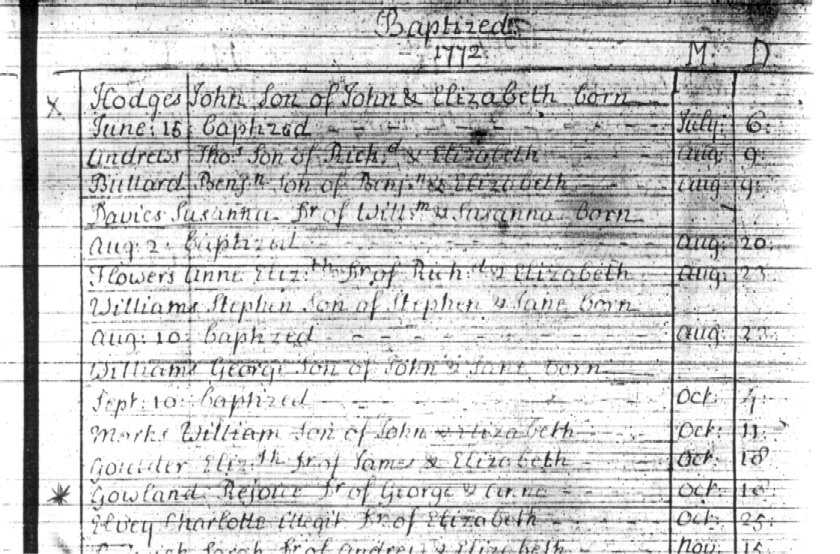 Child of Thomas and Hannah GOWLAND baptised at Christ Church, Spitalfields (the source for this is the IGI, a copy of the original record has not yet been obtained):