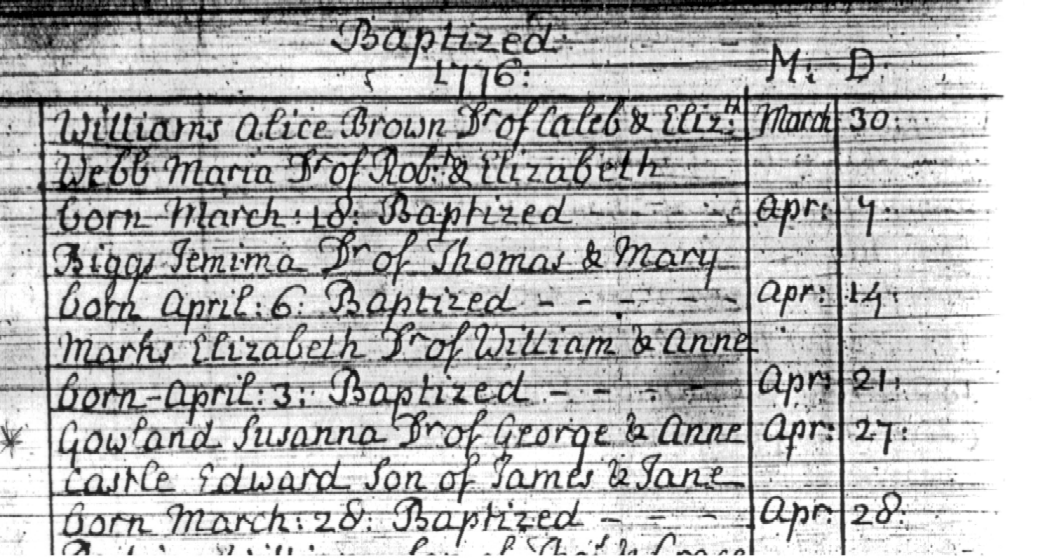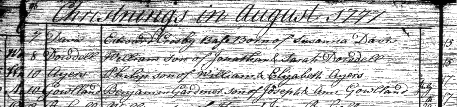 My research relied on several sources, including the Buckland by Dover births and the birth registrations at the Register of Nonconformist Births of the Dr Williams’ Library that Rosemary found. The IGI (the International Genealogical Index of the Mormon Church) provided some information, notably the birth of Susanna, but it was Dorothy Holden, a volunteer researcher in Dover, who discovered a large part of the new information, including the all-important document dating from 1748 MC with Joseph’s signature. The Gowlland family as a whole has benefited considerably from her efforts, which I would like to recognise here. More recently, a few more documents have been found and these have been incorporated into the annex.