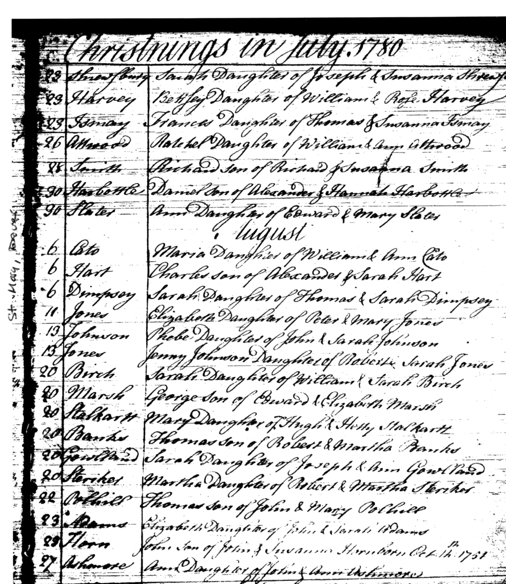 Stephen married Sarah SYMONS at St Clement’s, Sandwich, Kent, on 11/6/1770 by license (here and here). Stephen was of the parish of St Andrew, Canterbury, and Sarah of the parish of St Clement.